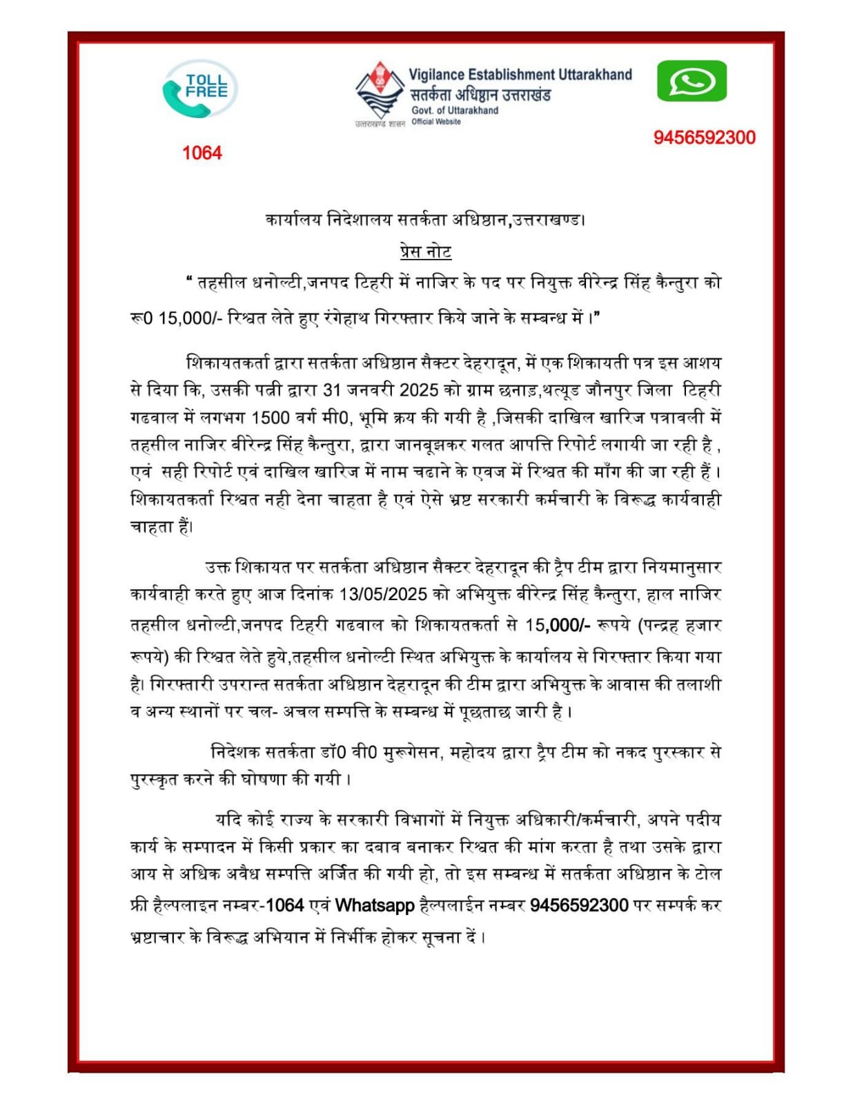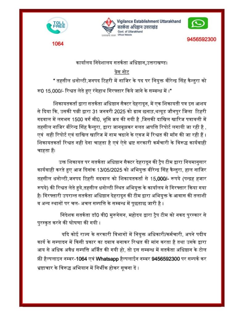 मुख्यमंत्री पुष्कर सिंह धामी के नेतृत्व में उत्तराखंड सरकार ने एक बार फिर यह स्पष्ट कर दिया है कि राज्य में भ्रष्टाचार के लिए कोई जगह नहीं है। धनौल्टी, टिहरी में तहसील नाजिर वीरेंद्र सिंह कैंतुरा को 15 हजार रुपये की रिश्वत लेते हुए विजिलेंस टीम द्वारा रंगे हाथ पकड़ा जाना कोई सामान्य घटना नहीं, बल्कि एक बड़ी कार्रवाई है—जो दर्शाती है कि शासन-प्रशासन अब पूरी तरह सक्रिय और सजग है।