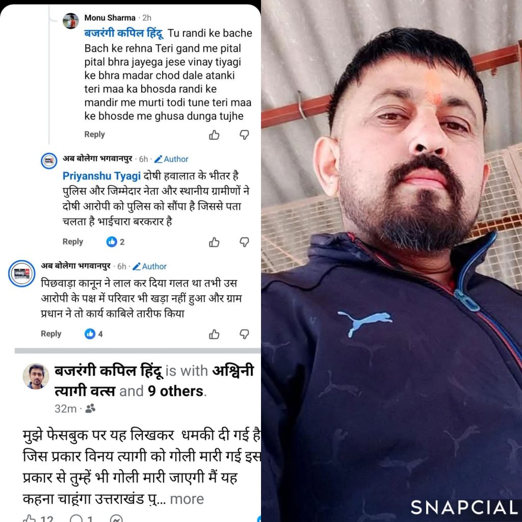 फेसबुक पर खुलेआम जान से मारने की धमकी का मामला सामने आया है। बजरंग दल से जुड़े हिंदुत्व कार्यकर्ता कपिल त्यागी (फेसबुक पर पहचान: बजरंगी कपिल हिन्दू) को सोशल मीडिया के माध्यम से यह कहकर धमकी दी गई कि “जिस तरह विनय त्यागी को गोली मारी गई, उसी तरह तुम्हें भी गोली मारी जाएगी।”